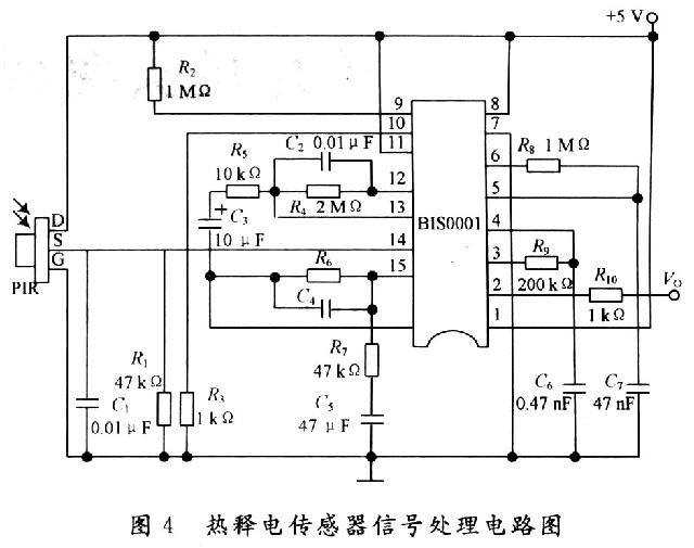 本设计采用BIS0001来完成对热释电传感器输出信号的处理。BIS0001是一款具有较高性能的热释电传感器信号处理集成电路,它主要由运算放大器、电压比较器、状态控制器、延迟时间定时器以及封锁时间定时器等构成。由BIS0001构成的信号处理电路如图4所示。