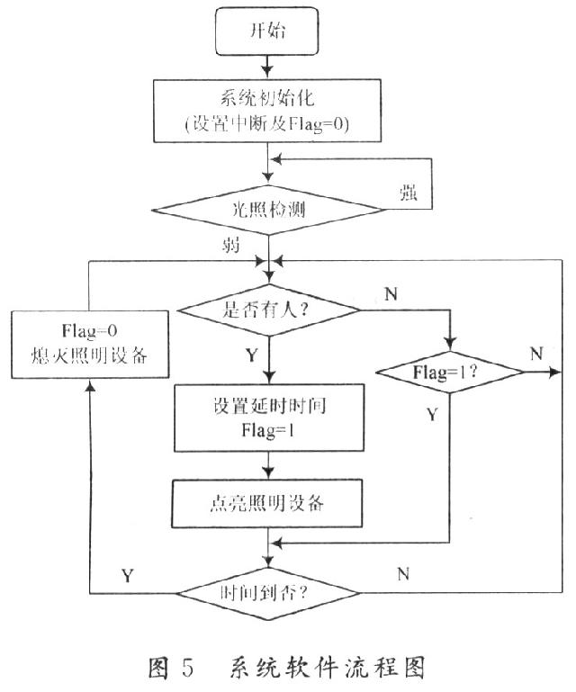 软件部分的主要任务是完成对光照检测电路和对热释电传感器信号处理电路的输出信号进行处理。在光照较强时,系统继续对光照检测电路的输出状态进行检测。光照较弱时,系统对信号处理电路的输出状态Vo进行检测。若室内有人时Vo为高电平,系统控制照明设备点亮并按设定的时间进行延时。在延时时间内再一次检测到有人时,则系统又按设定的时间进行延时;若在延时时间内检测到室内无人时,则系统控制照明设备熄灭并重新对信号处理电路的输出状态Vo进行检测。基于上述分析,系统软件设计流程如图5所示。