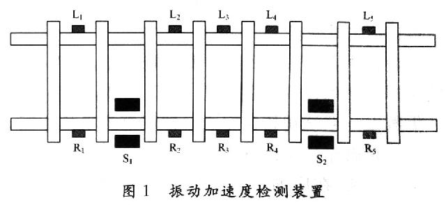 振动加速度擦伤检测系统通过检测车轮和铁轨动态接触时发生碰撞产生的振动加速度来判断车轮踏面的状态。图1为振动加速度法的传感器布局图。其中,L1,L2,L3,L4,L5及R1,R2,R3,R4,R5为压电式振动加速度传感器,S1,S2为光电开关。由于压电式振动加速度传感器的输出为电荷信号,可选择使用电荷放大器输出与电荷量成比例的电压信号,在后续的采集电路对此电压信号进行采集与转换时,假设列车从左向右行驶,当车轮行驶到S1处时,光电开关被挡断,产生开启采集数据信号,DSP采集系统对10个传感器输出信号进行采集和存储;当车轮行驶至S2处时,光电开关被挡断,产生停止采集信号,采集系统停止数据采集,保存数据讲行数据处理,显示处理结果。
