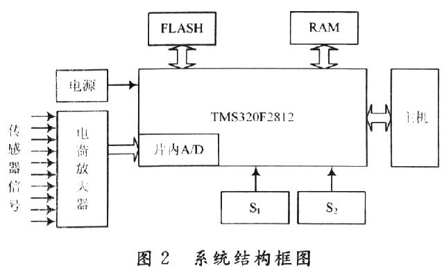 利用压电式振动加速度传感器对加速度信号进行检测。采用TI公司的DSP芯片TMS320F2812作为系统核心,使用片内自带的12位16通道A/D转换器对传感器信号进行采集,因此不再需要另加其他A/D转换芯片,只需对相关引脚进行配置并引出通道引脚即可。扩展RAM存储器用于存储采集数据,同时扩展FLASH存储器用于程序代码的存储;S1,S2光电开关信号作为外部中断送入DSP;与外部主机的通信采用了DSP片内SCI接口实现。系统整体结构如图2所示。
