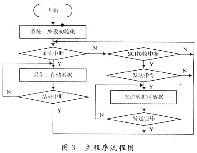 软件开发采用TI的DSP集成开发环境CCS 2.0,开发语言采用了C和汇编的混合方式。主程序可分为4个模块,分别为主程序监控模块、SCI通信模块、A/D数据采集模块和中断服务程序模块,软件流程图如图3所示。软件应完成对多通道模拟信号的采集转换,并在收到正确的主机数据传输指令后将其所采集到的数据按一定的格式传送给主机处理。