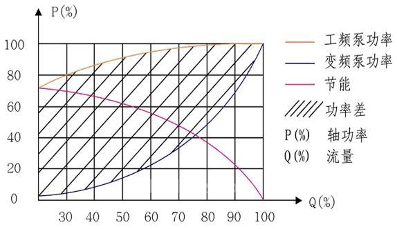 由流体传输设备水泵、风机的工作原理可知:水泵、风机的流量(风量)与其转速成正比;水泵、风机的压力(扬程)与其转速的平方成正比,而水泵、风机的轴功率等于流量与压力的乘积,故水泵、风机的轴功率与其转速的三次方成正比(即与电源频率的三次方成正比)根据上述原理可知:降低水泵、风机的转速就,水泵、风机的功率可以下降得更多。例如:将供电频率由50Hz降为45Hz,则P45/P50=(45/50)3=0.729,即P45=0.729P50(P为电机轴功率);将供电频率由50Hz降为40Hz,则P40/P50=(40/50)3=0.512,即P40=0.512P50(P为电机轴功率)。