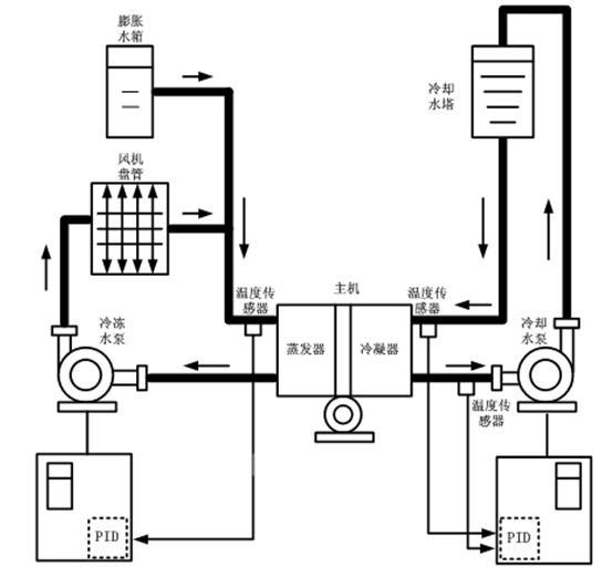 对于冷却水系统,取冷凝器两侧冷却水的温度作为控制参数,采用温度传感器、PID温差调节器和变频器及冷却水泵组成闭环控制系统,冷却水温差控制在△T2,使冷却水泵的转速相应于热负载的变化而变化,而冷却水的温差保持在设定值不变,使系统在满足主机工况不变条件下,冷却水泵系统节能最大。