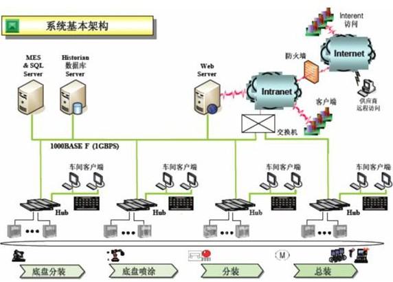• 软件系统包括应用程序模块(如接口界面、主数据管理、订单跟踪和排产、主机跟踪和生产监控、可追溯、报表系统,等等)、数据库(关系性数据库、实时数据库)、自动数据采集、信息广播,等等。软件系统采取三层架构,兼顾B/S 和C/S 模式的分布组织。