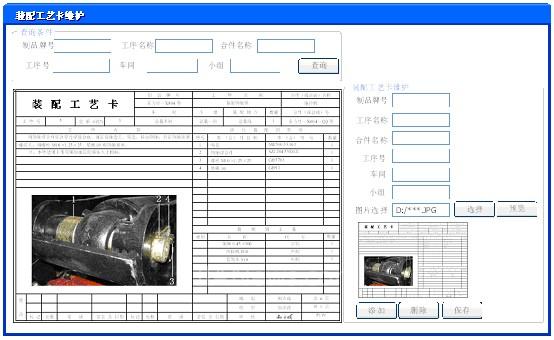 所有生产工位都显示装配工艺卡图片,装配工艺卡的数据维护建立查询和维护界面。对单个工艺卡数据进行维护操作,具体包括新增工艺卡,修改工艺卡和删除。