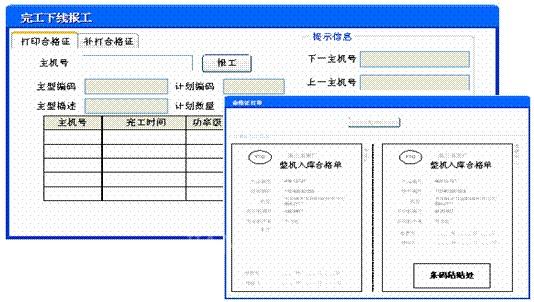 每台主机下线检查合格后,需要打印合格证。合格证打印位于质检线后,当主机到达该工位后,操作人员通过选择主机号码,确认后系统自动打印出该主机的合格证和主机条码。