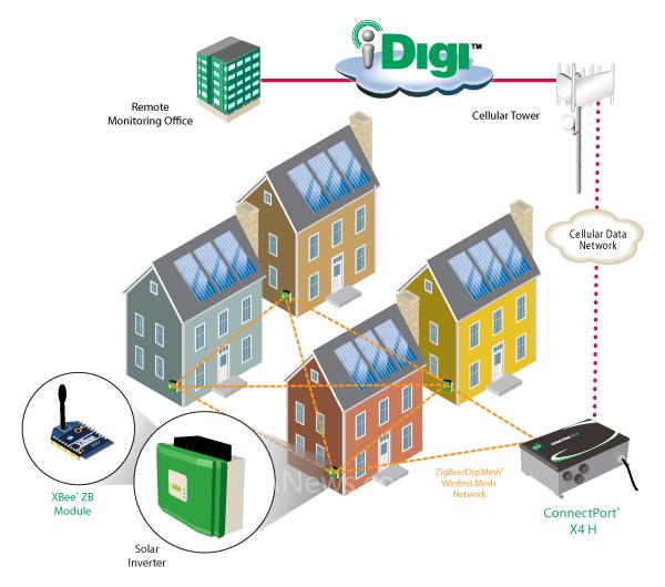 ConnectPort X4 H网关从所覆盖区域内的每一个带有XBee的太阳能逆变器上采集数据,并将信息通过蜂窝数据网络发送到基于互联网的iDigi云。用户和服务性公司可以从全球任何地方方便地实时访问这些信息。