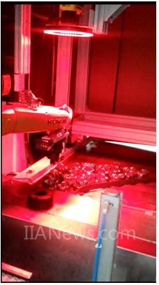 另外的挑战就是,“上料区域较宽,相机取像视野相对大,因此要捕捉‘骨节’两侧较细小的特征点来反馈0°-360°角度。”他接着指出,“工件种类有多种,外观、大小都有差异,‘骨节’凹槽深度在40mm左右,一方面要凸显骨节特征,另一方面还要照顾到凸台小特征,光源比较苛刻。”