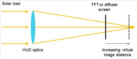 图 2:HUD光学器件将太阳能负载放大到散射屏或薄膜晶体管(TFT)面板上