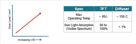 为了更好地理解为什么散射屏具有优势,我们不妨来看看散射屏与传统TFT面板的物理特性(图4)。散射屏具有的两大主要优势在于可在更高的温度中工作,此外散射屏不会吸收大量的太阳入射可见光谱,这一点更加重要。(光谱的红外[IR]和紫外[UV]部分很容易被过滤。)