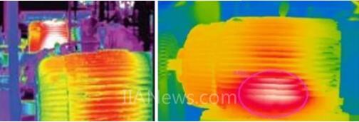 通过红外热成像检测,可以发现电机整个定子表面温度非常高,电机定子两端温度较低,中间较高,此类异常可能由于过载或者绝缘材料老化导致。并非散热异常引起。而定子表面局部发热,可能由于局部铁芯损坏、铁芯片间短路、匝间短路导致。