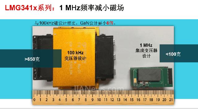 GaN技术都到关注,很大原因在于它赋予产品的承压上限。与一般36V、5.5V电源产品不同,LMG341x真正属于高压范畴,系列产品电压可达600V。与此同时,GaN产品可以在很高频率的开关电源里工作,600V输入一般只有100kHz频率,而TI的GaN产品频率可以跑到1MHz,是传统频率的10倍。与此相对应的是,是传统频率的10倍。另外,频率的提高又可以显著地减小变压器、电感和电容的体积,因此整体体积减小6倍的GaN产品才得以面世。除了体积之外,GaN产品效率也值得一提。