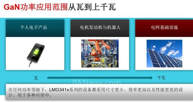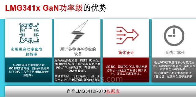 在应用GaN的的具体功率器件中,TI主推了LMG3410R050、LMG3410R070和LMG3411R070三款产品。它们的竞争优势在于:1、更小、更有效的解决方案。与硅金属氧化物半导体场效应晶体管(MOSFET)相比,德州仪器的集成GaN功率级可将功率密度提高一倍,并将损耗降低80%。每个器件都具有快速的1MHz开关频率和高达100V/ns的压摆率。2、系统的可靠性。此系列产品组合接受了超过2000小时的包括加速和应用内硬开关的设备可靠性测试。并且,每个器件均提供集成的散热和高速、100ns过流保护,以防止直通和短路情况。3、每个功率级的设备配套服务。50mΩ或70mΩ条件下,本产品组合中的每个器件均提供一个GaN FET、驱动器并提供保护功能,可为低于100W至10kW的应用提供单芯片解决方案。