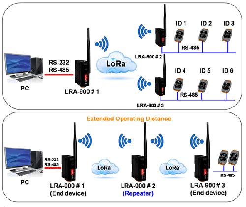 LRA-900是一个RS-232/RS-485转LoRa 的无线数据转换器,它是采用透明传输的方式将RS-232/RS-485 上的数据转成LoRa无线讯息并传送出去,LRA-900 提供在 1000 bps 的无线鲍率与直线可视的环境下可达到 1500 公尺的传输距离,为了克服在恶劣环境中可能会遇到的干扰,LRA-900 可以调整无线传输鲍率最低到 250 bps,以增强抗噪声与抗干扰的能力。此外,可调整无线频道与群组ID的特性,可有效的避免相邻的两个 LRA-900 间网络数据相互干扰。用户可以透过简单的调整32 段的频道与 256 个群组ID来实现区分与控制不同的 LRA-900 网络。大部分的设定方式都是透过旋钮与指拨开关完成,也可透过简易之设定工具软件来调整进阶的模块设定参数。
