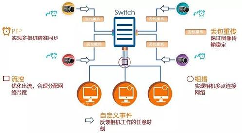 得益GigE Vision接口的强大,海康威视网口工业面阵相机采用丢包重传机制,保证图像传输稳定;引入流控机制,从而实现网络自适应;支持组播功能,实现相机多点网络连接;支持PTP功能,实现多相机时间精准同步;支持自定义事件,保证系统间的完美协作。