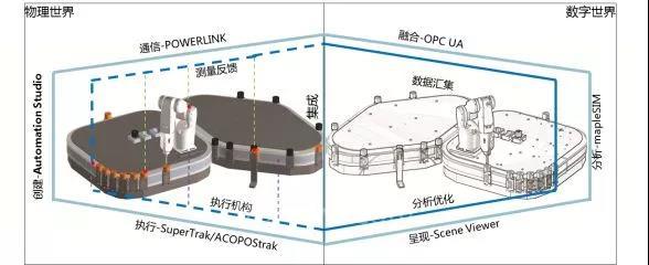 图7反映了与德勤所提供的相似的数字孪生实现架构,通过工业现场的实时通信POWERLINK,以及集成开发平台Automation Studio、物理的对象SuperTrak/ACOPOStrak和机器人,建模仿真软件、OPC UA实现的互联来构成整个产线的数字孪生架构。
