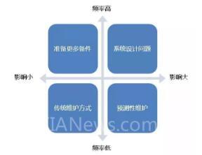 首先,为什么说电机的振动温度监控属于预测性维护呢?我们来借鉴美国智能维护系统(IMS)中心的分类,参考下图,纵轴代表故障发生频率,横轴表示故障发生后的影响。预测性维护适用于发生频率不高,但一旦发生影响很大的故障。