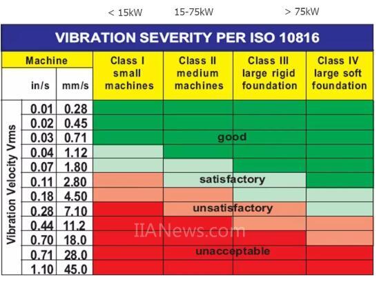 邦纳的振动温度传感器,机理模型基于国际监测评估标准ISO 10816,输出振动的均方根速度值(RMS)。用户可以基于均方根速度值的电机健康状态分析,不需要技术专家,也不需要对机理模型进行研究。