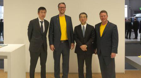 文字说明:在汉诺威工业博览会上确认双方合作:Hiroshi Satoh,广濑国际业务部总经理;浩亭技术集团首席执行官Philip Harting;广濑总裁石井和生;HARTING Electronics董事总经理Ralf Klein(从左至右)。