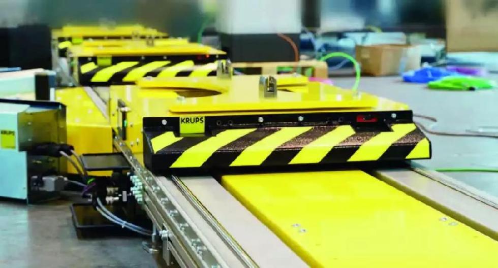 在许多地方,汽车制造商或1级供应商的生产大厅都采用类似于时钟的机制。每个工作站的机器和工人的操作步骤都紧密同步,使得被处理的对象可以返回工作流中。然而,若有任何环节出现卡壳,尤其是生产输送系统,则整个工厂都会杂乱无章。Krups是一家装配和测试自动化领域的市场领导者之一。该公司专门生产可高效连接装配和测试工作站的自动化系统。其全新的e-Cart系统配有可旋转、提升、夹紧或倾斜工件的主动供电式智能工件载体。