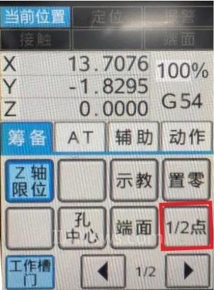 5、点击“1/2点”按键后,机床会自动移动到刚才碰过的两边的中心位置。