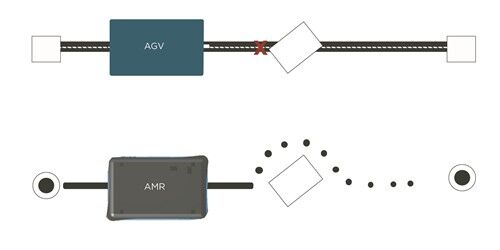AMR 可以安全地绕过障碍物和人,而 AGV 必须等待障碍物离开它的轨道。