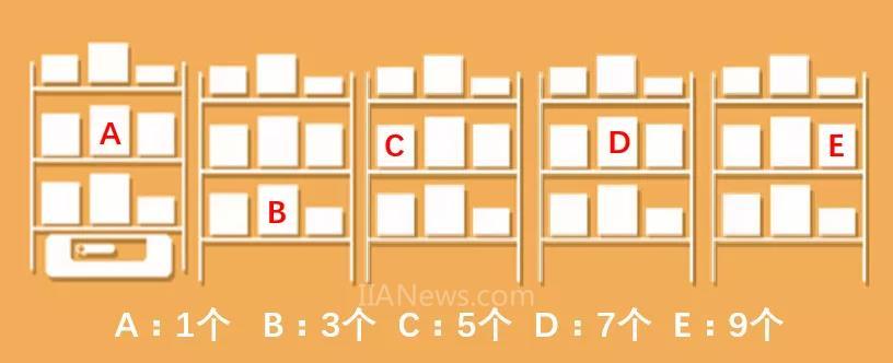 如下图,例如某品牌墨镜的库存有5条,分列在A、B、C、D、E这5个货架上,其对应数量分别是1、3、5、7、9个。