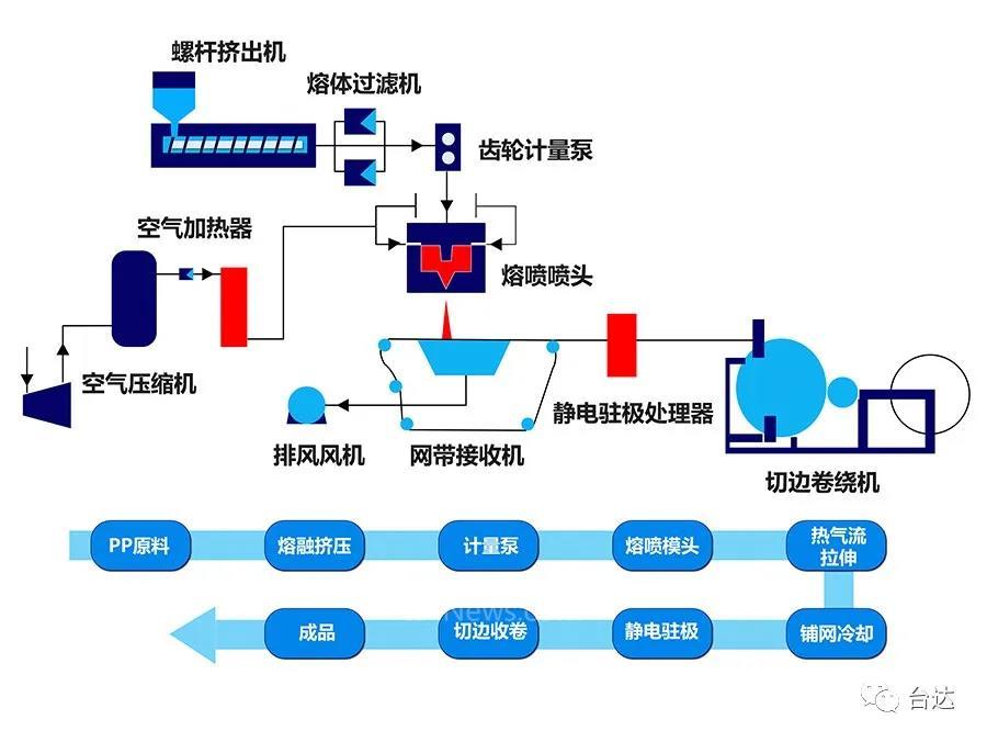 熔喷布,全名为熔喷法非织造布,其生产工艺一般包含熔融挤出、熔喷工艺以及驻极处理等步骤。这些步骤看似不难,即便小企业也可采购挤出机、喷头、滚筒、空压机等设备,让产线跑起来。但实际的品质控制上却极难保证。因为这涉及到不同的原料对应的最佳熔融温度、挤出力度和流量、喷熔模头的选择、喷熔温度和牵伸热空气速度,以及产线整体速度的同步控制。