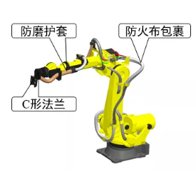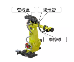 目前市面上的主流是波纹管管线包,即将波纹管作为外护套对线缆实现防护,使用摩擦球对波纹管外侧易损部位加以保护,对于功能比较复杂的应用会在波纹管上增加弹簧伸缩装置,以尽可能保证管线服帖机器人且便于调试,上海发那科的CPP管线包也是如此。另一种是使用防磨材质(一般是耐磨、耐高温的布料)对管线进行包裹,在机器人法兰上增加一件C形法兰,管线通过支架、弹簧最后与C形法兰服帖接触,该方案被部分机器人厂家采用,但因该方案结构上精巧且对线束的要求很高,实现的技术难度大,且需要维护人员严格按照技术要求进行维护,所以相比波纹管管线包较为少见。下图是上海发那科的两款管线包产品,主要应用于点焊和搬运应用。