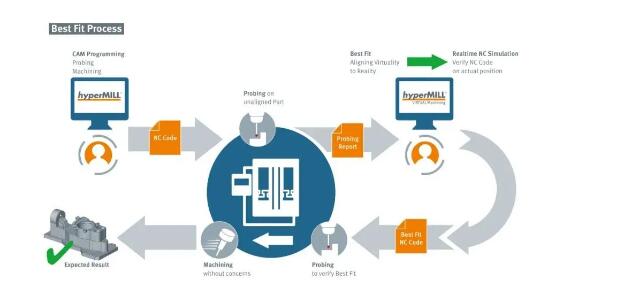 凭借 hyperMILL BEST FIT,我们开发了一种智能化零件对齐程序,该程序已集成在CAM系统中,因此可为该问题提供有效的解决方案。其思路是:在CAM中实时对齐。在机床上使用 3D 检测功能对未找正的零件进行检测,检测点以检测报告的形式发送回CAM系统。然后,hyperMILL BEST FIT将调整NC代码以精确地匹配实际零件位置。从而使虚拟世界(编程)与现实世界(装夹)相匹配,而非相反!