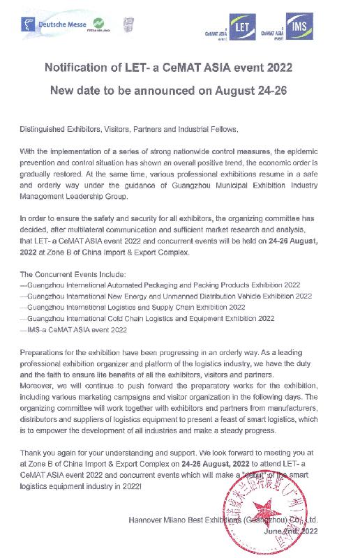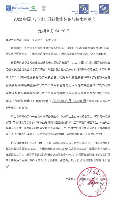 感谢省商务厅的认可与信任,站在新征程上,2022汉诺威LET广州物流展将继续积极探索物流新领域,为行业同仁提供更广阔的视野与平台,共同迎接时代机遇。
