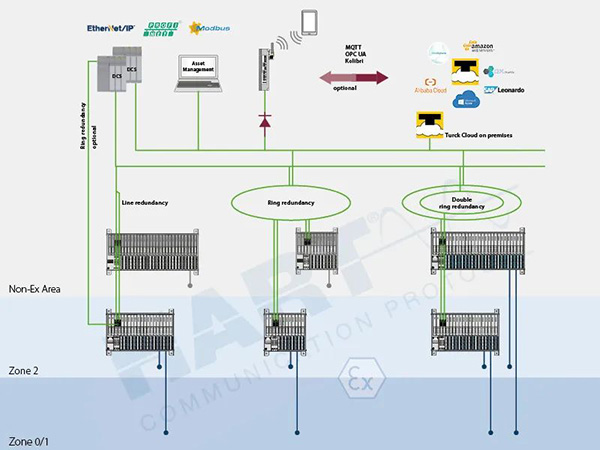 无论是将excom用于1区、2区还是安全区域,用户都可以使用相同的DTM,EDS或GSDML,并使用相同的操作方式,这无疑减少了大量的培训工作,并确保专业人员在不同工厂区域中灵活使用。图尔克的Cloud组件和边缘设备(例如TX700)是调用和路由并行过程数据的理想解决方案,为工业应用量身定制的图形用户界面简化了相关信息的选择。分析系统可以托管在图尔克云或其他供应商提供的云方案中,也可以托管在本地网络中,支持图尔克的加密Kolibri云协议、MQTT以及OPC UA等协议。