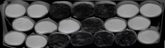 电芯划痕,由于划痕出现不规则,使用了红色激光+蓝色LED组合方式,使用散射图像可清晰的找出缺陷位置。