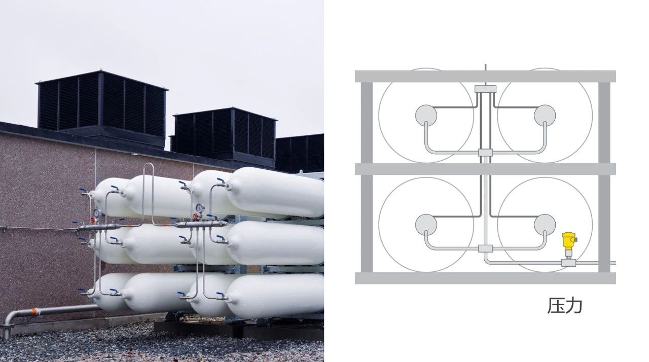 氢气储罐根据其尺寸大小,能够储存不同容量的氢气,可用于加氢站或氢气运输等。为储存尽可能多的氢气,会将储罐最高增压至1,000 bar。但在常温下,氢仍旧始终处于气态。使用VEGABAR 83压力变送器,可测量并相应地控制压力,通过干式电阻应变片实现可靠测量。