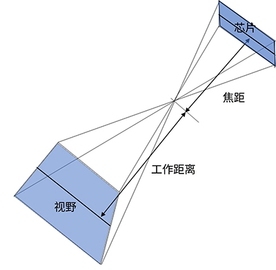 依据芯片尺寸信息、需要的中间视野、相机工作距离可以大致确定镜头的焦距(简化为下图所示的相似三角形计算)。