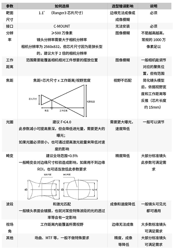 镜头有很多参数,有些参数是必须的,有些会影响测量精度,有些会影响对应速度。用户可依据各自实际需要确认某些参数是否是必须的。镜头主要参数以及参数选择如下: