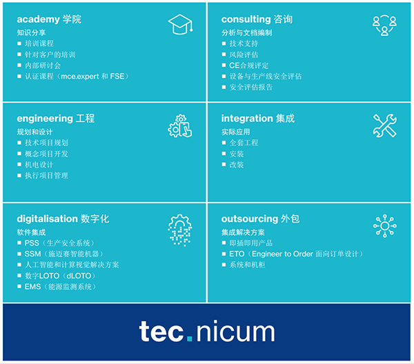 此外,我们独立于制造商的安全技术服务团队tec.nicum,在机器人安全的各个领域,从咨询服务到机器人工作站的风险评估到一站式交钥匙工程,都拥有丰富的安全专业知识,为您提供全方位的保驾护航。