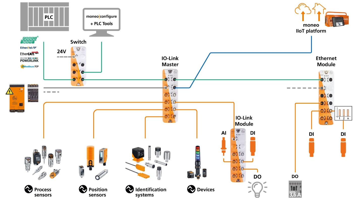 通过IO-Link主站,可以将IO-Link设备集成至几乎任何现场总线和控制系统架构,从而连接PROFINET、EtherNet/IP或AS-i等系统。PLC的功能块可以简化编程。IO-Link是由自动化行业的领先制造商开发的开放标准,并一直在不断改进。它甚至能将阀岛等执行器连接至IO-Link主站,从而打造更灵活更精简的工厂架构。