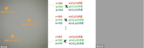 在应对色彩一致性方面的严格要求时,解决色偏问题需精准地对图像中的各个区域,依据其实际的偏色状况进行细致矫正。理想的做法是,区域划分得越精细,矫正的效果便越理想。若能实现以单个像素为基本单位进行精细矫正,则将达到最理想的矫正效果。同时,面对图像均匀性的严格要求,又要对图像亮度进行矫正,也就是平场矫正 - 针对图像的不同区域亮度偏差进行调整,同理,区域划分越小,矫正效果越理想;