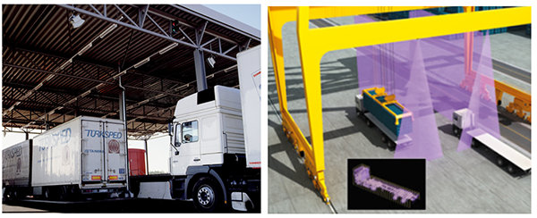 在港口集装箱堆场,为了确保高效的吊/放集装箱,集卡必须准确的停放到起重机吊具下方,以便于不用移动起重机或小车即可实现吊装,需要对集卡的车型、长度、宽度、高度等关键尺寸,装卸区域状态进行测量。