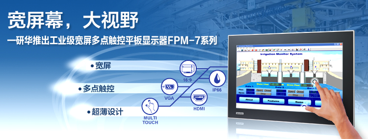 研华工业等级宽屏显示器FPM-7151W是专为满足广泛应用及灵活性需求而设计。16:9显示比例较4:3显示比例的显示器多提供40%以上的可视面积,可显示更多的信息。FPM-7151W具有IP66防尘防水防护等级。通过USB接口,多达10点触控功能可获得更加精准的控制及观看信息。FPM-7151W除了支持VGA和DVI-D接口,还同时支持VGA和HDMI接口。