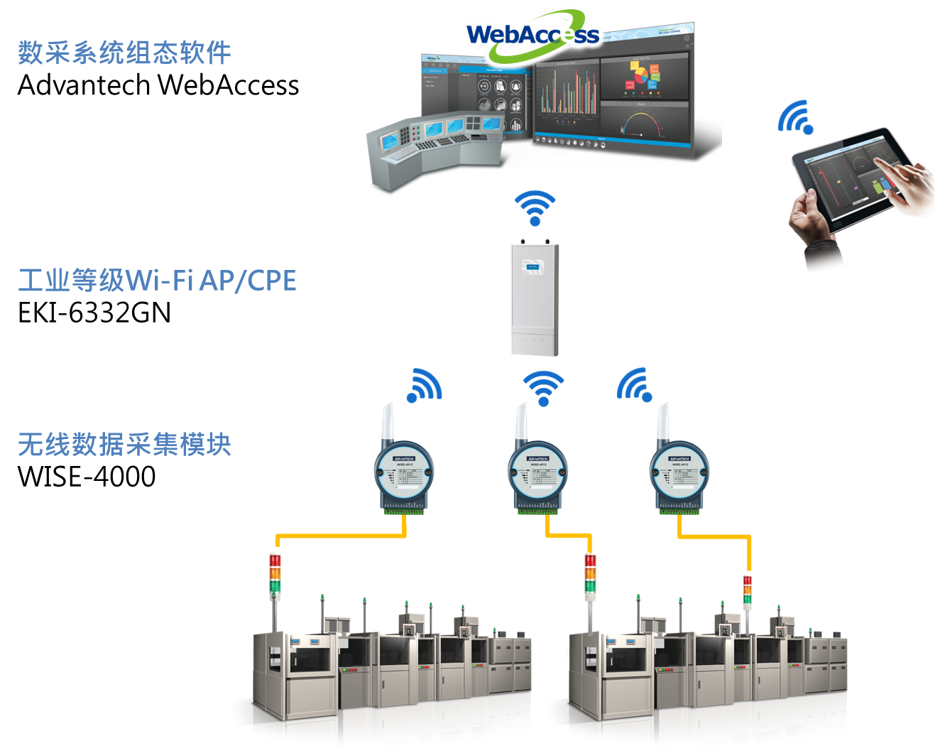 通常在电子制造车间中,各式各样的机台设备状态由三色灯显示,然而,三色灯状态仍需作业人员于现场巡检,无法实时远程掌握设备状态,更无法自动计算机台稼动率。 若在办公室即可查询车间机台状况、随时掌握设备稼动率及告警状态,将生产状况每分每秒实时呈现,便能大幅降低管理负担,让管理者专注于机台调度、排程等决策事务,强化工厂管理,有效提升生产效率。