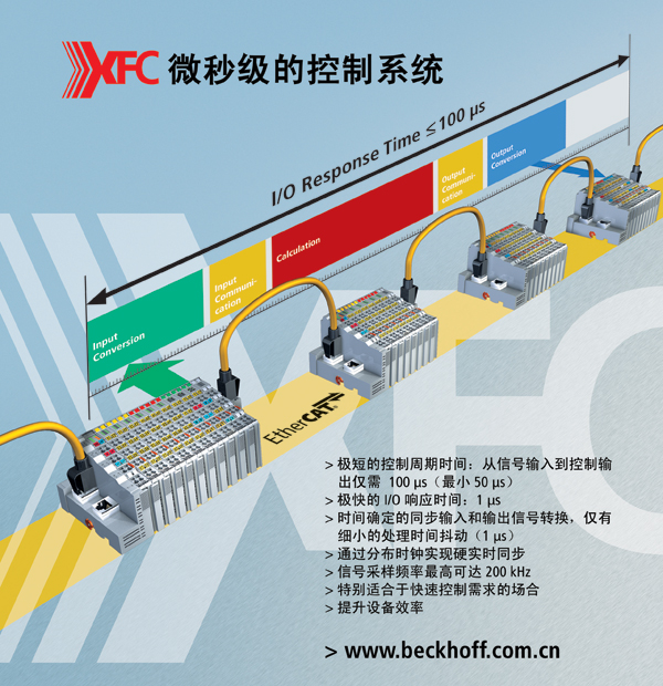 由于采用了先进的 XFC 技术,Beckhoff 可为您提供一套全新理念的高速控制解决方案:XFC 基于高效的控制和通讯架构,包括高性能工业 PC,带有实时特性的超高速 I/O 端子模块,EtherCAT 高速工业以太网系统和 TwinCAT 自动化软件。采用 XFC 技术,可以实现 I/O 响应时间 ≤100 μs。因此,该技术为以前由于受技术限制而无法满足性能要求的用户提供了一种全方位提升控制性能的新理念 。 | ||