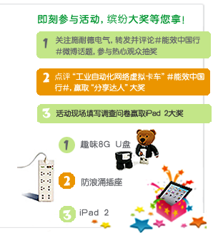 施耐德电气"能效中国行—工业自动化卡车巡展"途经 40 个大中型城市、历时 5 个月、行程超过 20,000 公里,将一系列完整的、全面提升的解决方案带到用户身边! 本次巡展活动中,工程师们“零距离”地接触施耐德电气在工业领域的能效产品,感受到相关解决方案的卓越性能,并了解了施耐德电气在各个行业中的成功案例。期待您和您的业务伙伴在节能增效技术及工程应用领域方面,与施耐德电气的工程师们展开积极的互动交流。 查看活动详情 》 |