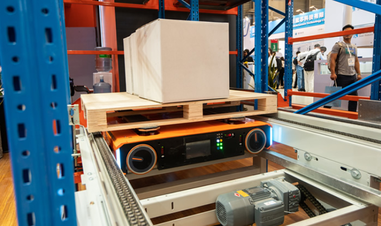 智能四向穿梭机器人利用其四向行驶能力和潜入货架底部的通行方式,在同层实现接近AGV场地的灵活调度。