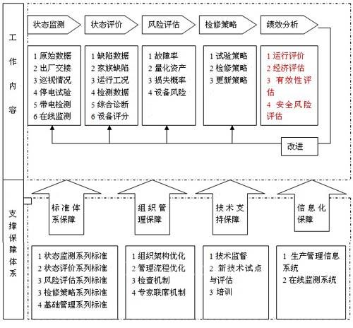 南方电网状态检修工作是精细化的设备管理模式,是对传统的输变电设备管理各环节,即设备的资料管理、交接验收、运行巡视、缺陷管理、试验检修、技改更新等的进一步优化。具体操作中状态检修工作体系包括“状态监测”、“状态评估”、“风险评估”、“检修策略”、“绩效分析”几个环节的工作,并支撑以标准体系、管理体系、技术储备、信息化四个支撑保障体系。如图1所示。