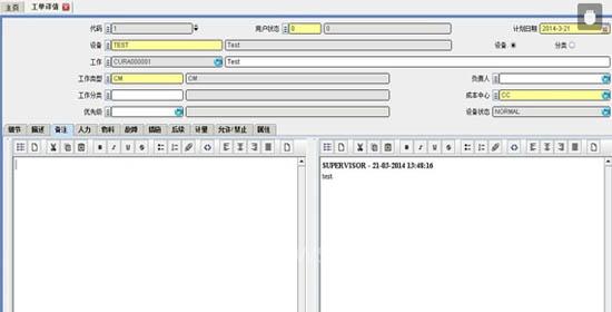 通常,用户在左边界面输入备注,一旦工单保存完毕,备注将被移到右边,以该用户的“签字”作为前缀(可以在“系统工具>权限配置>签字”中进行设置),并配有时间戳(格式可自定义)。