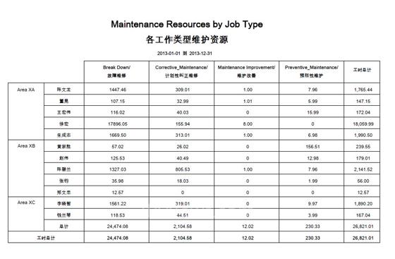 各工作类型维护资源:该报表可辅助维护经理跟踪不同类型工作所需的人力资源情况。