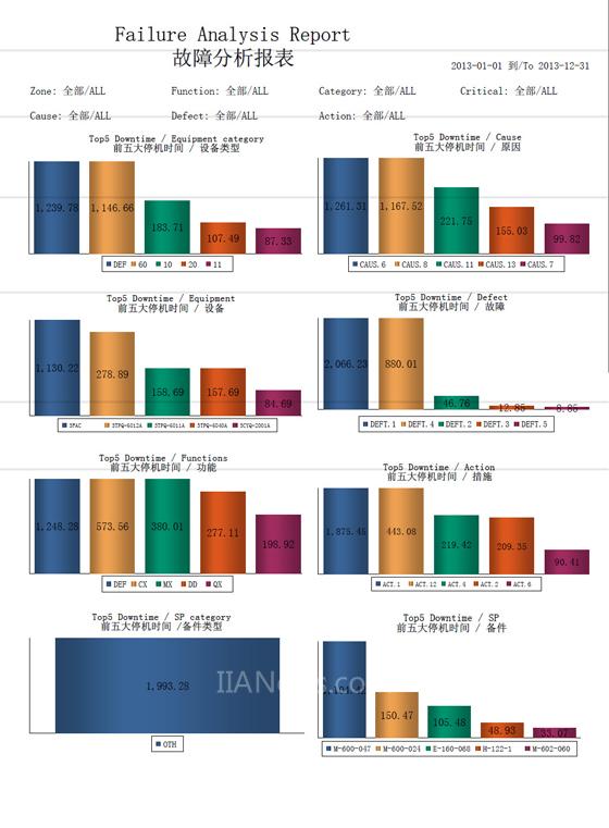 故障分析:从设备类型、设备、故障、功能、措施、备件类型、备件的角度,显示“前5大停机时间”,辅助维护团队分析故障原因。