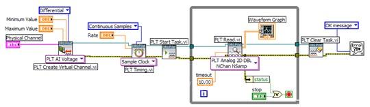凌华科技为 PCI-9846提供了LabVIEW驱动。安装DAQPilot驱动程序后,在LabVIEW的函数库中可以找到DAQPilot工具包,其中提供了数据采集的控制函数,其功能与调用方法与NI的DAQmax对应,使用非常方便。例如,由下图中的四个函数:PLT Create Virtual Channel、PLT Timing、PLT Read以及PLT Clear Task就构成了完整的连续数据采集功能。另外,DAQPilot中还提供了模拟和数字信号的输入、输出等各种功能的LabVIEW范例程序,方便开发者快速上手。